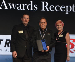 ![]() John Prosser (center left) and Dino Perfetti (center right) of Automotive Concepts received the Restyler of the Year award. | ![]() Brandmotion was PRO’s 2015 Manufacturer of the Year. | ![]() Chair Scott Wolin (left) and Chair-elect Ellen McKoy (right) congratulate Josh Poulson (center), PRO’s 2015 recipient of the Nat Danas Person of the Year award. |
