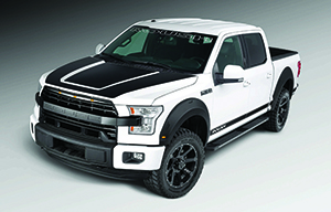 Shelby engineers teamed up with Fox shocks and BDS Suspension to engineer a custom-tuned performance suspension only available on the ’16 Shelby F-150. It features four aluminum-body, Fox 2.5-in. internal bypass reservoir shocks with dual speed adjusters. The Shelby F-150 features 18-in. custom Shelby wheels paired with next-generation BFGoodrich All-Terrain KO2 tires specifically designed for off-road performance. Shelby will build these F-150s through a manufacturing and distribution partnership with select Ford dealers through Tuscany Motor Co. Shelby will only offer 500 of these Shelby F-150 trucks through a select network of Ford dealers. Five color and stripe combinations are available, including Black, Blue Flame, Magnetic, Oxford White and Race Red.