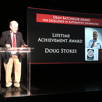 Doug Stokes was presented the Motor Press Guild’s 2015 Lifetime Achievement Award for his exceptional behind-the-scenes public-relations contributions to motorsports and the racing industry. |