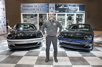 Pietro Gorlier, head of MOPAR parts and service, FCA – Global, with the Pitch Black/Billet Silver and Pitch Black/Contusion Blue MOPAR ’17 Dodge Challengers. |