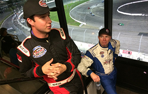 ![]() Trevor Huddleston (left) is interviewed in the Irwindale press box after winning the Irwindale Speedway’s 2017 LKQ Pick Your Part Late Model Championship and the California state title. Photo credit: IEC |