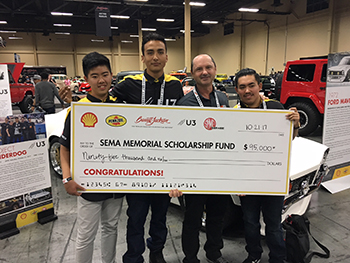 The ’72 Ford Maverick built at the SEMA Garage in Diamond Bar, California, under the tutelage of actor Sung Kang sold for $95,000 at the Barrett-Jackson auction, October 21, in Las Vegas. SEMA Cares Chairman Tim Martin (second from right) holds the check with the student builders (L-R) Tony Chen, Christian Quiroz and Alexis Hernandez. |