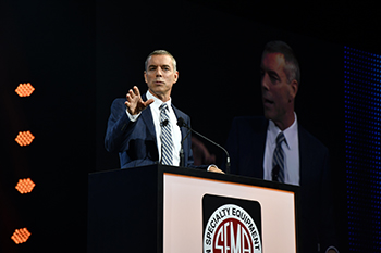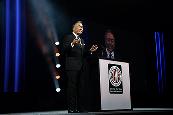 SEMA President and CEO Chris Kersting welcomed guests to the industry-wide gathering and paid tribute to the icons who passed in 2017. | SEMA Chairman of the Board Wade Kawasaki stressed the importance of replenishing the automotive specialty-equipment industry with young talent and outlined SEMA’s youth initiatives. |
