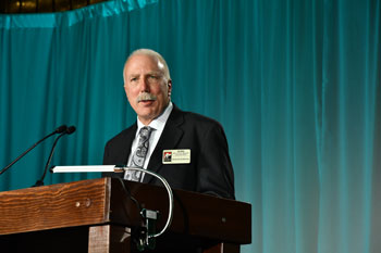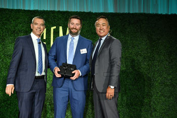 ![]() SEMA President and CEO Chris Kersting (left) and SEMA Chairman of the Board Wade Kawasaki (right) honored longtime SEMA Counsel Russ Deane, who retired. | ![]() SEMA Cares Chairman Rich Barsamian encouraged guests to sponsor a Pinewood car to help raise money for children’s charities. | |