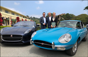 ![]() (L–R): Bruce Qvale, John Nikas and Kendel Qvale stand behind a ’18 Jaguar F-Type and a ’64 Jaguar E-Type. |