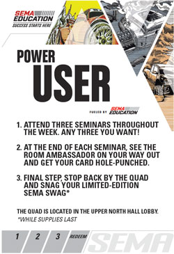 ![]() To recognize attendees who make education a priority, new for 2018, SEMA Education will highlight regular seminar attendees as Power Users. |