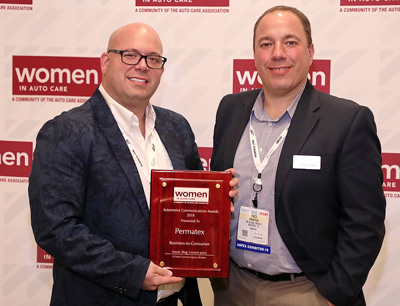 Donny Braga (left), Permatex senior product manager, and Paco Agrafojo, Permatex director of marketing, accept the 2018 Automotive Communications Award for Best Business to Consumer-Article/Blog/Content Piece. |