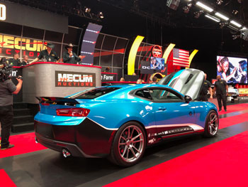 ![]() The SEMA Cares ’18 Chevrolet Camaro SS, built by Petty’s Garage and sponsored by OKI Data and APE Wraps, sold for $60,000 last Saturday at Mecum Auctions in Kissimmee, Florida. |