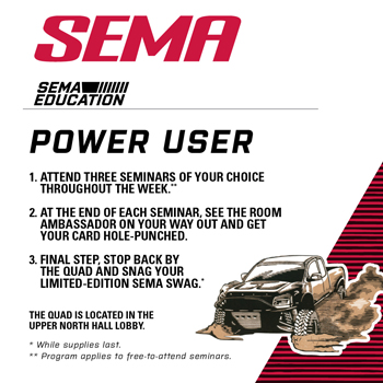 ![]() To recognize attendees who make education a priority, SEMA Education will highlight regular seminar attendees as Power Users. |