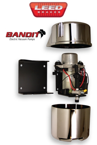 Leed Brakes Bandit Vacuum Pumps are a Rotary Vane style electric vacuum pump. This style pump is 30% more efficient and 60% quieter than a traditional vacuum pump. Bandit Pumps are available in three styles: Naked, Black Canister or Chrome Canister. They are pre-assembled and prewired for simple 2 wire installation. Every kit includes 6-ft. of vacuum hose, wire harness, ring terminal, 15A fuse, mounting hardware, and hose clamp. Canister dimensions are 7-3/4-in. tall x 6-3/4-in. from mounting bracket to face of canister. Pump dimensions are 7-1/4-in. tall x 4-3/4-in. wide x 5-in. max depth. | ![]() |
