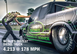 The Hot Shot’s Secret-sponsored Firepunk Diesel S-10 Pro Mod race truck not only retained its title as the world’s fastest diesel door slammer, it also slammed down the track to extend the world record to 4.213 seconds at 178 mph in the eighth-mile at last Saturday’s Outlaw Diesel Super Series (ODSS). Driver Larson Miller showed up to the Hardway Sunshine Showdown at Emerald Coast Dragway to secure another Pro Mod championship.