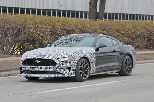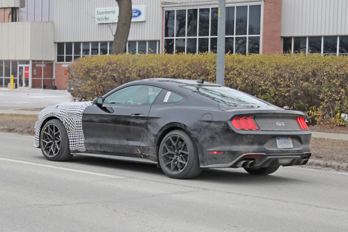 Clearly based on the current S550 Mustang GT, the prototype is wearing light checkered camo on the front end along with a smorgasbord of parts from various current Mustang variants: the lower splitter and side skirts are from the new Mach 1, the dual-tip dual exhaust is an option on the GT and EcoBoost models, while the wheels are from the Mach 1 Handling Pack.
