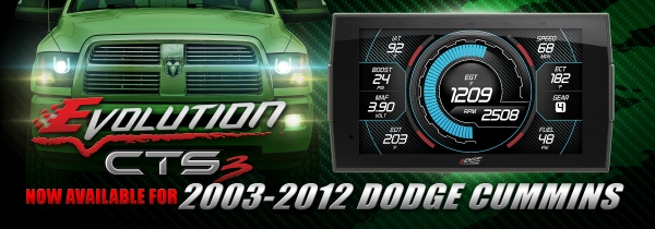 Introducing the next generation Evolution CTS3 for the 2003-2012 Dodge/Ram Cummins Turbo Diesel with the all-new, full-Color Touch Screen. The CTS3 will continue to include all of the great features, benefits, and extended coverage from the CTS2 product line, all while adding a sleek, new exterior and cutting-edge screen. The best look in the industry delivered via a revamped, slim case design and a 5-in. full-color capacitive edge-to-edge display with true swipe screen technology. Not only is the display sharper, but the higher resolution screen delivers a tremendous pixel ratio and top-notch graphics. CARB EO coverage also allows the Cummins Evo CTS3 to be sold in all 50 states! New screen layouts, faster processing speeds, and WiFi update capability are just a few things that set the Evolution CTS3 apart from all other competitors.
