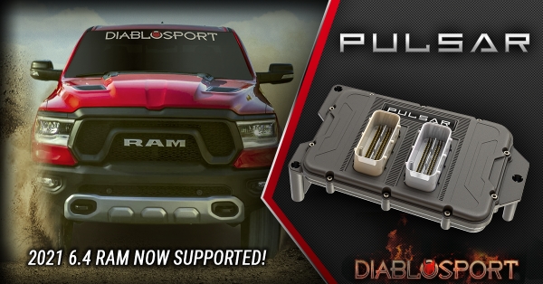 DiabloSport has announced that the most innovative tuning solution for late-model Ram trucks is now available for the ’21 Ram 2500/3500 6.4L Hemi models. Pulsar, 32454, offers on-the-fly tuning, with eight preset levels to choose from. Power levels and options are changed right through your factory steering wheel controls. From increased horsepower and torque, to the ability to adjust tire size or gear ratio, Pulsar offers the features you want for your ’21 Ram 6.4L truck.