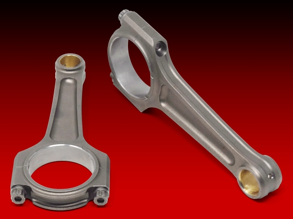 Based on forgings of 4340 aircraft quality vacuum degassed steel or 300M alloy, the I-beam is undercut so it has ribs that resemble a shallow “H.” The ribs continue around the pin end to reinforce it and maintain pin bore roundness. Similarly, the caps are ribbed to reinforce the big end and ensure housing roundness.