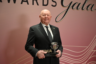 Gene Winfield holding his SEMA Hall of Fame trophy at the Awards Gala.
