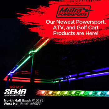 Metra PowerSports by Metra Electronics will display several new products, including a six-zone switch panel designed for UTVs and other outdoor vehicles, a 4-AWG high-current, quick-disconnect power block, a four-piece chasing LED golf cart canopy kit and Heise Connect RGB controller crossover cables. Metra's off-roading and powersports SEMA booth, #60031, will be in the West Hall of the Las Vegas Convention Center from October 31 to November 3. Metra Electronics' off-roading and powersports products will be on display at Metra Electronics Booth #60031 in the West Hall.