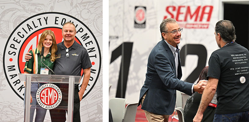 (Left image) SEMA Chair Kyle Fickler, right, and his daughter, Danika Fickler. (Right image) SEMA President and CEO Mike Spagnola met with SEMA Business Members during the 2023 SEMA General Membership Meeting.