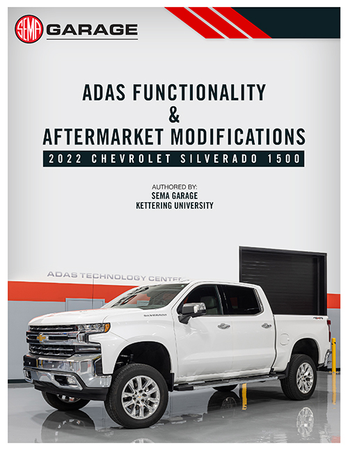 At the 2023 SEMA Show, the SEMA Garage announced its all-new advanced driver-assistance systems (ADAS) research white paper, "ADAS functionality and aftermarket modifications - 2022 Chevrolet Silverado 1500," which highlights groundbreaking research in the field of lifted vehicles equipped with ADAS.