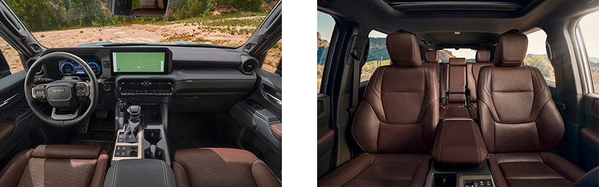 Inside the vehicle, the Land Cruiser is equipped with the latest technology and premium accessories. A new 8- or 12.3-in. multimedia touchscreen displays Toyota's latest Audio Multimedia system. The system also supports wireless Apple CarPlay and Android Auto compatibility and pairs with an available 14-speaker JBL audio system. Qi wireless charging is available with enhanced power output. Dual USB-C charging ports are included in the front row and two for second-row passengers. There are two more USB-Cs available and a standard 2,400-watt AC inverter house type plug (120V) in the cargo area. An available 12.3-in. digital gauge cluster with four different styles and customizable widgets is also available.