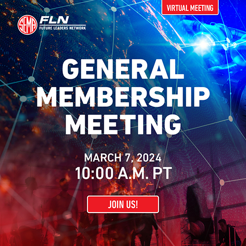 The SEMA Future Leaders Network (FLN) is hosting an online General Membership Meeting on Thursday, March 7, at 10:00 a.m. PST/1:00 p.m. EST.
