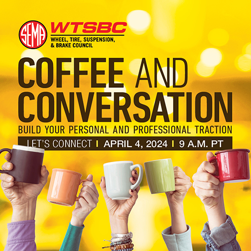 SEMA members have limited time to register for the Wheel, Tire, Suspension & Brake Council (WTSBC) Coffee and Conversation online networking event, taking place on Thursday, April 4, 2024, at 9:00 a.m. PDT.
