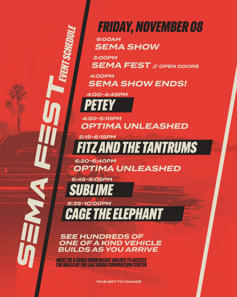 The band and activation schedule for the second annual SEMA Fest event, Friday, November 8, is now live (see the graphic below and visit SEMAFest.com for tickets and the complete details).