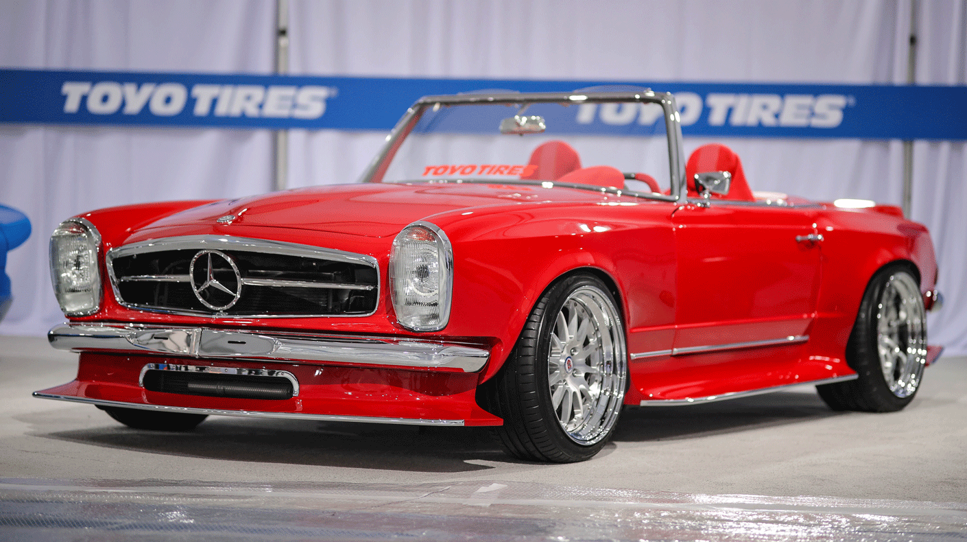 Toyo Treadpass, a longtime favorite destination for SEMA Showgoers, premiered 26 unique vehicles, including this stunning bright red Mercedes convertible.