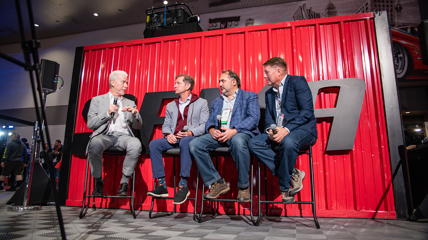 The 2024 SEMA Media Panel included (left to right) moderator Dan Neil, The Wall Street Journal, Jamie Butters of Automotive News, Sam Abuelsamid of Forbes and Mark Vaughn of AutoWeek.