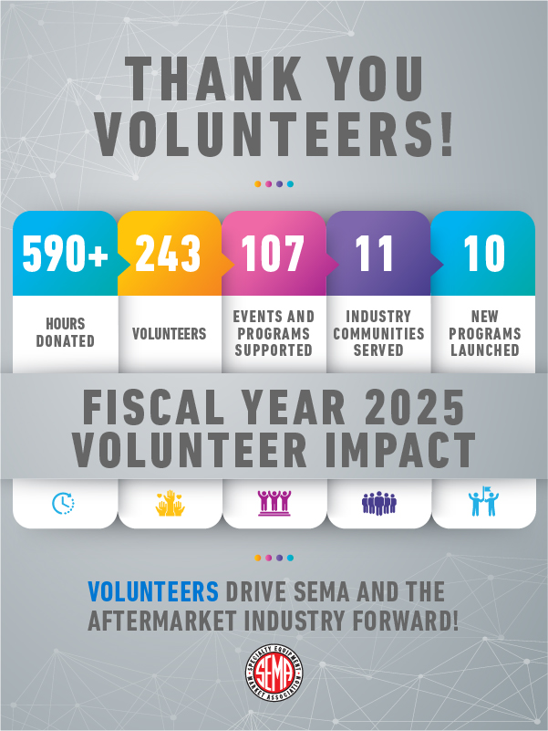 "We are fortunate to have so many volunteers that donate their time and talents to help SEMA accomplish its mission of fostering the success of the automotive aftermarket," said Marcy Yanus, SEMA senior director, member engagement. "We extend our deepest gratitude for them and their contributions that have driven the industry forward in amazing ways."