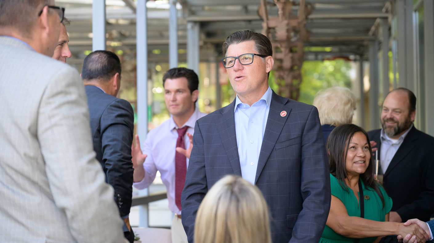 California Senate Minority Leader Brian Jones speaks with 2025 SEMA California Rally guests during the Sacramento event.