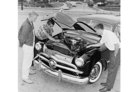 This outtake from Rickman’s shoot shows Schiefer with stacks of aluminum blanks that would be machined into flywheels. As Pendergast wrote in his story, Schiefer had developed a process he called “Albro” that bonded bronze facings onto aluminum flywheels and pressure plates, “thus arriving at a combination offering light weight and superior heat emisitivity properties, along with a lasting friction surface.” At the time, Schiefer made aluminum flywheels priced from $52–$70 “for all popular engines,” wrote Pendergast. Schiefer had also just added clutch applications priced from $50–$60 for Chevy V8s, including the Corvette. “Corvettes are hot,” said Schiefer’s ad in that April issue, “but every Corvette and Chevrolet owner should realize that only the new Schiefer lite-weight pressure plate assembly and the exclusive bonded face flywheel will eliminate all clutch worry and flywheel blowup.” |