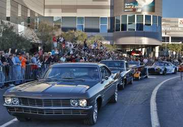![]() Even as exhibitors in the trade-only 2015 SEMA Show wrapped up their last transactions, hundreds of custom vehicles roared to life and poured out the doors of the Las Vegas Convention Center to join the eagerly anticipated SEMA Cruise. Outside, approximately 3,000 delighted enthusiasts waited, lining the streets to witness a steady stream of custom musclecars, perfectly restored classics, high-performance pro-tourers, outrageous off-road machines, exquisite hot rods, stylish lead sleds, sleek sports cars, fabulous lowriders, imported exotics and all manner of one-of-a-kind, built-from-the-ground-up creations. As daylight faded into night, the crowd took a short walk across the street to the vast Gold Lot, where attendees discovered that the party had just begun. |