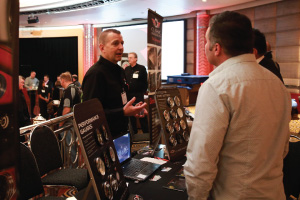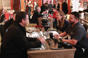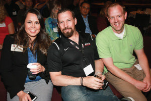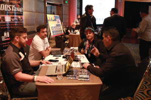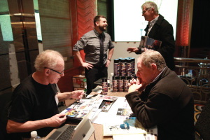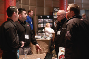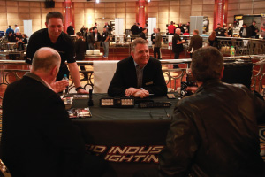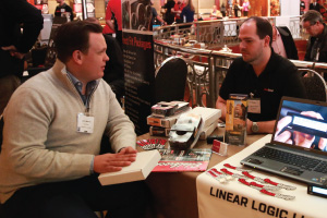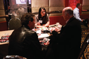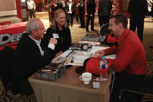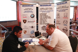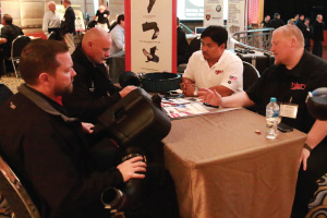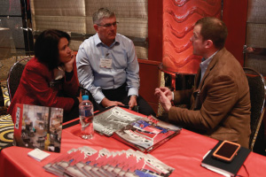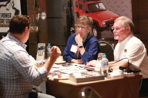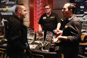 | Left Picture: Attending the program (from left) were Erika Garcia of BOLT Locks by STRATTEC, Josh Abbott of Borla Performance, and Kyle Wickenheiser of Keystone Automotive Operations. Middle Picture: Trever Chick (standing left), director of product and market development for Rigid Industries LED Lighting, and Jim Hillis, the company’s vice president of sales, met with buyers. Right Picture: Craig Paisley (right), business developer for World Motorsports, discussed the firm’s performance titanium wheel lugs with a potential customer. | ||||