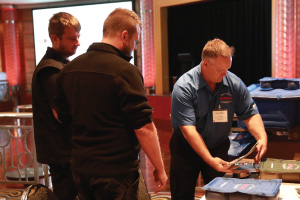 | Left Picture: Erika Garcia (center), sales manager of BOLT Locks by STRATTEC, joined 19 other exhibitors in gathering buyer leads that they were planning to follow up when they returned to the United States. Middle Picture: Joey Snyder (middle), sales and marketing manager for Linear Logic LLC, and Ronald DeLong (right), the company’s owner, talked with a variety of trade buyers attending the SEMA Australia program about the firm’s line of ScanGauge products. Right Picture: James Pittman (right), president of Pittman Outdoors “AirBedz,” demonstrated his product to Australian buyers. AirBedz has been featured on ABC’s “Shark Tank” television show. The visiting U.S. delegation met with pre-vetted buyers at a daylong trade-only event. | ||||
