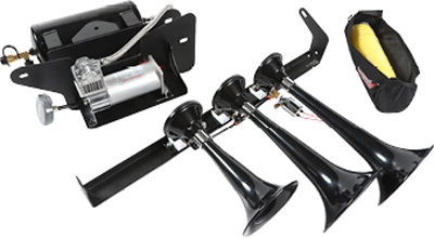 Kleinn Air Horns | The VELO15-230 bolt-on kit features a heavy-duty 150-psi compressor,1.5-gallon tank and Kleinn 230 train horn. No drilling, cutting or welding required. Kit includes custom-designed brackets for easy installation. System supports airbags, air tools and is rated for 35-in. tires. Kit includes a quick-connect tire inflator with storage bag. PN: VELO15-230 Information: www.kleinn.com or 520-579-1531. |