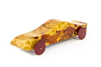 Meaux said he spent 80 hours building the car, which he named “Split Decision.” As with last year’s car, it was made of an exotic wood—this time, amboyna burl from Thailand. The display box was made of a solid block of ironwood burl. Both were harder than the Asian satinwood burl Meaux used last year and offered more stability.
