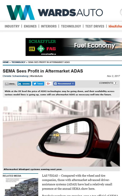 | Wards Auto Wards Auto ran a detailed piece on SEMA’s ADAS study and the opportunities the systems bring to the aftermarket industry. The article identified some of SEMA’s efforts to help members embrace and take advantage of the opportunities, and it highlighted a couple of the almost 100 ADAS-related exhibitors at the 2017 SEMA Show. | Las Vegas Sun In his 2017 SEMA Show preview article in the Las Vegas Sun, Mick Akers described how ADAS products were among the most anticipated at the Show. Akers identified the types of products that make up the ADAS segment and interviewed a representative from Thinkware, maker of dash cameras that can be used to monitor teenage and elderly drivers. | FenderBender In his 2017 SEMA Show preview article in the Las Vegas Sun, Mick Akers described how ADAS products were among the most anticipated at the Show. Akers identified the types of products that make up the ADAS segment and interviewed a representative from Thinkware, maker of dash cameras that can be used to monitor teenage and elderly drivers. | ||
