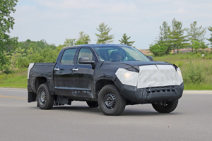 Toyota’s Tundra Hybrid?This is a Toyota Tundra prototype undergoing testing in Ann Arbor, Michigan. It seems to be a prototype for the first-ever hybrid variant. While following this Tundra for about 3 mi., observers could detect the familiar Hybrid Synergy Drive hum, followed by the engine kicking in at around 25–30 mph. The truck had pretty narrow tires compared to the Tundra spied back in January. According to a source, “Toyota’s fullsize truck will use a version of the company’s 3.5L turbocharged V6 engine in combination with an electric motor/lithium-ion battery system.” The source said that the system is more powerful for the new Tundra and will reportedly produce 450 hp and 500 lb.-ft. of torque while getting 30-plus miles per gallon. | ![]() |