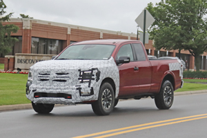 ’20 Nissan Titan Pro-4XHere’s a first look at the ’20 Nissan Titan Pro-4X testing in Farmington Hills, Michigan. Nissan will give the fullsize Titan a modest facelift for ’20. However, changes on the outside will be limited to a revised grille, lights and tailgate design. Modern connectivity features are also expected as the company upgrades, providing what looks to be a large infotainment system across its lineup, but the Titan’s looks to be the largest system offered on a North American Nissan model yet. Other interior changes concern revised switches and materials that look to be more upscale. Rumors surround a V6 finally being added to the half-ton model and the XD diesel being dropped for the ’20 or ’21 model year. | ![]() |