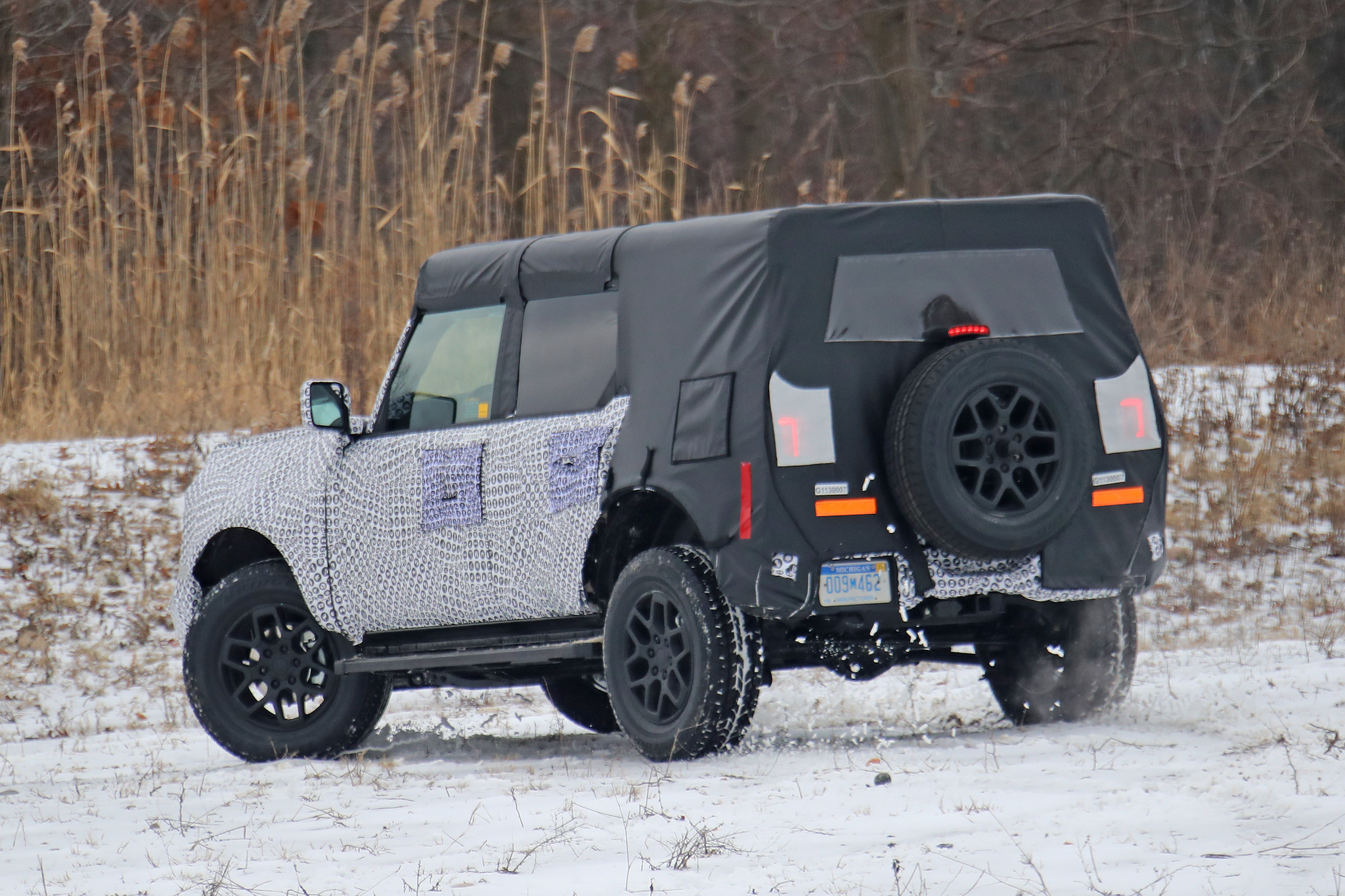 ’21 Bronco Four-DoorHere’s a look at the upcoming Ford Bronco while cold-weather testing. Upright front and rear ends along with upright pillars give way to short overhangs—elements that suggest an off-road-oriented nature. The prototype also has a solid amount of ground clearance. Much like the Jeep Wrangler, the Bronco will be available in both two- and four-door configurations. Powertrain details are a bit scarce at the moment, but a likely option will be the 2.3L EcoBoost mated to a 10-speed automatic transmission from the The Bronco is expected to be unveiled this spring and go on sale several months thereafter.