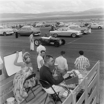 This photo, taken from the timing tower, shows NTA announcer Bob Fabel doing double duty on the microphone and the timer. The photo’s caption in the December 1957 Hot Rod read: “Sylvia Fore keeps score on king-size chart, recording top speeds at half-mile’s end and start to finish overall elapsed times.”