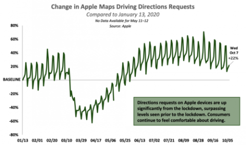 First and perhaps foremost for the aftermarket, the data shows that consumer vehicle use has risen steadily despite recent shutdowns. Public data from sources such as Apple indicate that driver map requests are up, along with actual miles driven. Moreover, surveys reveal that consumers prefer their personal automobiles to all other forms of public transportation. This is in part due to the sense of safety that personal automobiles provide over buses, trains and planes. Consumers are also increasingly using their vehicles not only for errands and city commuting but also for longer road trips