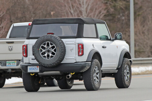 Here’s a first look at the ’21 Ford Bronco two-door with the fastback soft top. The model here is a Badlands trim without the Sasquatch package, meaning that it’s riding on the stock 33-in. wheels and tires. Outside of the strange exhaust tip and bright-yellow tow/recovery hooks (that appear to be spray painted), the model seen here is production-ready, and the fastback soft top does not look out of place on the two-door model. In fact, it looks pretty good and combines with the Bronco’s upright lines. The slight rear rake of the fastback soft top evokes the lines of the Chevy K-Blazer and first-generation Range Rover.