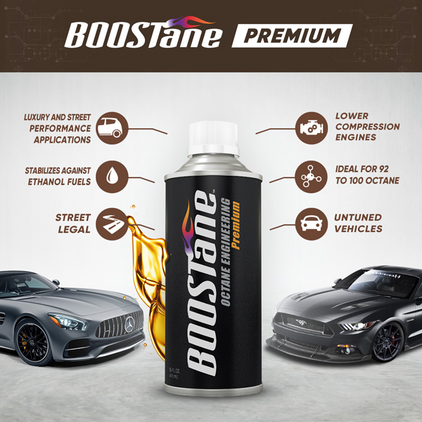 BOOSTane Premium is designed to raise regular pump fuel (93 or 91 octane) to as high as an effective 102-octane race-fuel equivalent (or 100 if starting with 91). Perfect for applications that have poor fuel quality, high temperatures and only 91-octane available, and/or performance vehicles with bolt-on components.
