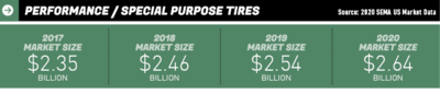 According to the “2021 SEMA Market Report,” the market size for performance and special-purpose tires, off-road and oversize tires and custom wheels grew to $2.64 billion, $2 billion and $1.45 billion, respectively, through 2020. While those numbers imply that the wheel and tire category stayed largely buoyant through the pandemic, some market observers caution that challenging undercurrents may lay ahead—especially for the tire industry.