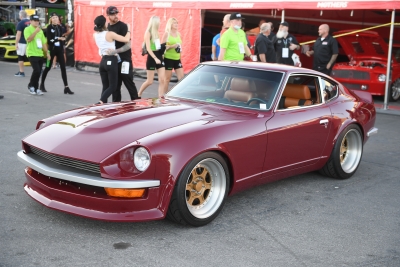 The 240Z is coated in rich burgundy paint and equipped with a custom-cut Subtle Z flare kit and Falken Azenis tires wrapped around 17-in. Bogart wheels.