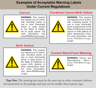 Prop 65 was a ballot initiative enacted by California voters in 1986. It requires warning labels on products containing chemicals listed as known to cause cancer, birth defects or reproductive harm. There are more than 1,100 chemicals currently on the list. Prop 65 doesn’t stop anyone from selling products, regardless of what chemicals they contain; it is simply a law that requires consumer warning labels under certain circumstances.