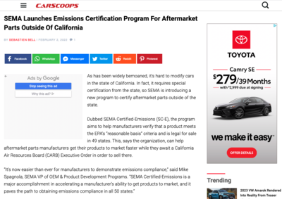 Under the new program, the SEMA Garage staff will assess manufacturers’ needs and advise as to the most appropriate path forward, whether that includes applying for a California Air Resources Board (CARB) Executive Order (EO) or SEMA emissions certification. The following are some of the publications that reported on how the SC-E program will give manufacturers much greater options and opportunities.