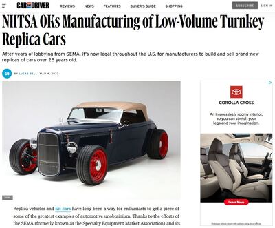 “This has been a long time coming,” wrote Stephen Edelstein, who reminded readers that SEMA was one of the strongest proponents of the new law. He also pointed out that while consumers could now buy turnkey replicas directly from a manufacturer, they will still have the option to buy and build kit cars.